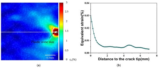 To present the maximum equivalent strain at the crack tip and the plastic zone size using the characteristic values of the fluorescence image and experimental conditions, the DIC method was used to determine the experimental results of two plastic zone parameters under the same condition. Figure 9a illustrates the typical equivalent strain distribution and plastic zone near the crack tip obtained using the DIC method. Figure 9b depicts the decay of equivalent strain from the crack tip marker along the white dot line. The maximum equivalent strain occurs at the position closest to the crack tip along the horizontal white dotted line. As reported, the plastic zone is defined as the region where the strain exceeds 2% [46]. The distance between the 2% strain boundary and the crack tip is regarded as the plastic zone size along the crack plane [47].