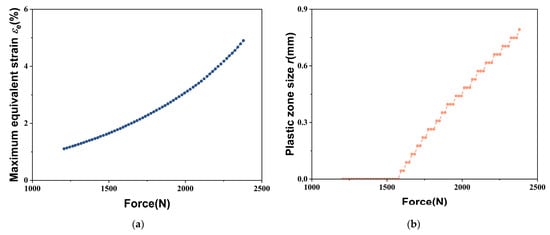 The change of the maximum equivalent strain at the crack tip throughout the uniaxial tensile deformation is shown in Figure 10a. It is observed that the maximum equivalent strain gradually increases with increasing applied load. Figure 10b plots the variation of the plastic zone size near the crack tip under the different applied loads. None of the equivalent strain values in the vicinity of the crack tip exceeded 2% for relatively low tensile loads, in which case the size of the plastic zone can be defined as zero. The plastic zone develops near the crack tip when the tensile load increases to approximately 1600 N. Subsequently, the plastic zone size exhibits an approximately linear increase with further increased applied load.