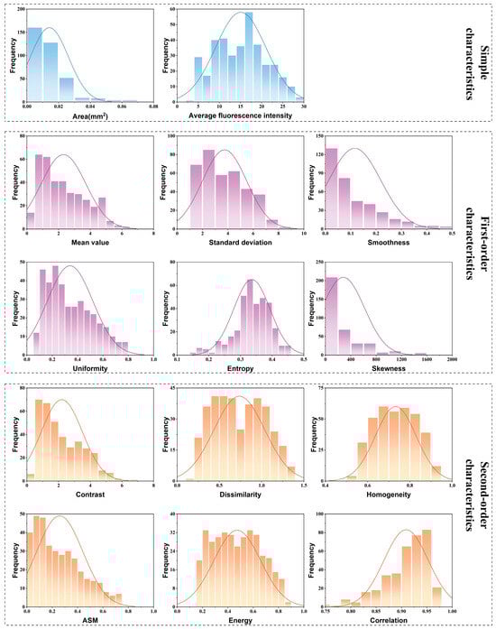 The grayscale histogram of an image serves as a robust tool for characterizing the distribution of pixel grayscale levels. Given that the grayscale levels distribution in textured regions exhibits a distinct pattern, first-order characteristic values can be extracted from the grayscale histogram of the fluorescence image to elucidate its texture features.