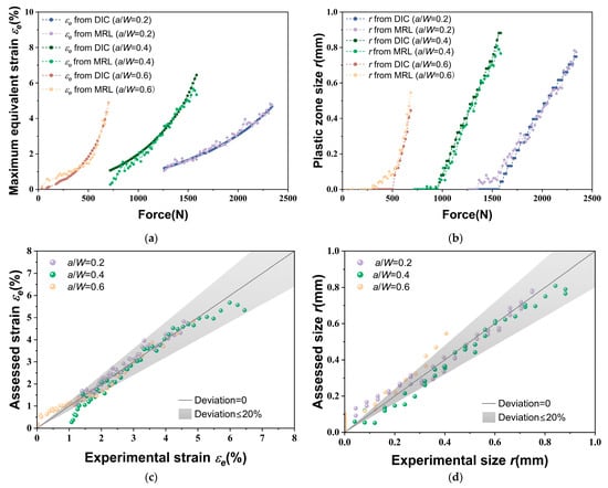 Comparison of the maximum equivalent strain and the plastic zone size between DIC experimental results and values obtained from the MRL-based method: (a) Maximum equivalent strain across various loads; (b) Plastic zone size across various loads; (c) Maximum equivalent strain at different a/W; (d) Plastic zone size at different a/W.