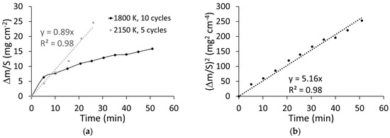 Figure 3a presents the evolution of the weight changes per unit surface (in mg cm−2) with time at 1800 and 2150 K. The data at the highest temperature can be fitted with a linear regression, which is not the case for the data at 1800 K, which appear to follow a square root trend. Therefore, in Figure 3b we have mapped the evolution of the square of the weight changes at 1800 K, which follows a linear trend. Thus, Figure 3 proves that the oxidation kinetic is semi-parabolic at 1800 K (Equation (1)) and linear at 2150 K (Equation (2)):