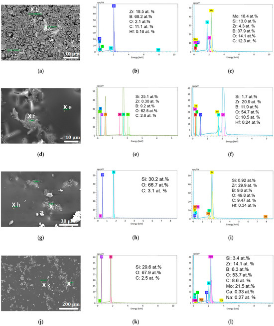 The surface SEM images and associated EDS analyses of two different spots are shown in Figure 5. The as-received sample has a rough surface (Figure 5a) made up of ZrB2 grains (darker areas, EDS in Figure 5b) and a MoSi2 intergranular phase (clear areas, EDS in Figure 5c). All of the oxidized samples (Figure 5d,g,j) display a full-cover vitreous phase with some clearer grains encapsulated within it. The EDS shows that both the amorphous and crystalline phases are oxides. Figure 5e,h,k show that the vitreous phase mainly contains Si and O elements in a proportion close to that of SiO2. Figure 5f,i,k demonstrate that the encapsulated grains are richer in zirconium. By comparing these results with those from the XRD, we can conclude that the vitreous phase is the amorphous phase displayed in Figure 4b and that the encapsulated grains correspond to the identified monoclinic and (minor) tetragonal ZrO2 phases. Crucially, we can also observe the presence of molybdenum in Figure 5l, which corresponds to the MoB phases identified through XRD. Some gaseous molybdenum trioxide may have also condensed on the sample during the cooling phase.