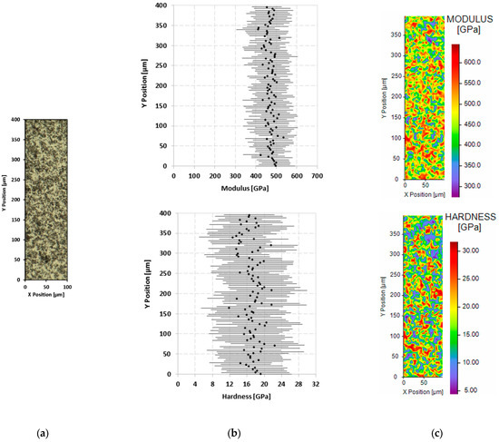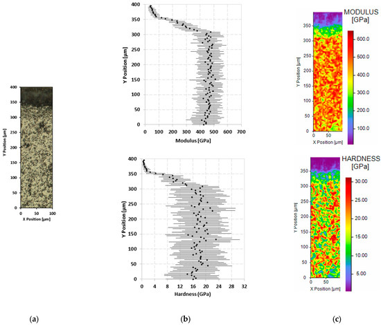 Results of nanoindentation test on the cross-section of the as-received ZBM sample: image from a numerical microscope (a), evolution of the averages and standard deviations of the elastic modulus and hardness along sample depth (Y axis) (b), and 2D mapping of the modulus and the hardness (c).