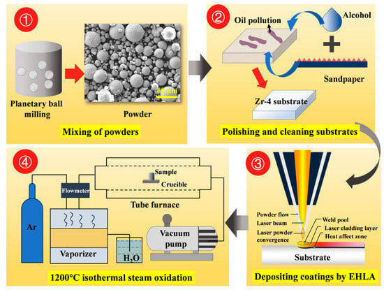 Commercially used Zr-4 alloy tubing (supplied by Western Xincai Technology Co., Ltd., Xi’an, China) was employed as the substrate in this study, with its chemical composition provided in Table 1. The tubing dimensions were 9.5-mm outer diameter, 0.57-mm wall thickness, and 300-mm length. Spherical FeCrAl alloy powder (commercial grade) and pure chromium powder (99.99% purity, particle size: 30–70 μm, supplied by Nanchang Guocai Technology Co., Ltd., Nanchang, China) served as coating materials. Yttrium oxide (Y2O3) particles (99.99% purity, particle size: 0.5 μm, sourced from Shanghai Maclin Biochemical Technology Co., Ltd., Shanghai, China) were blended with FeCrAl alloy powder at varying mass ratios using planetary ball milling. Table 2 presents the elemental composition of Cr/FeCrAl-based coatings with different Y2O3 additions. Figure 1 shows the experimental methodology flowchart.