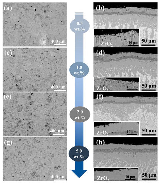 Figure 4a,c,e,g displays the surface morphology of four Y2O3-modified composite coatings (0.5–5.0 wt.% Y2O3), with corresponding EDS mappings shown in Figures S2–S5. The coating surfaces are dense, free of cracks or porosity. Compared to the Cr/FeCrAl coating, the addition of Y2O3 significantly reduces the presence of spherical oxides of Fe, Cr, and Al on the surface. This is likely due to the incorporation of Y, which effectively slows down the oxidation rate [20]. Furthermore, from Figures S2–S5, it can be observed that the distribution of Y is closely aligned with that of Zr. This is attributed to the similarity in atomic mass (Y: 88.906 amu; Zr: 91.224 amu), which leads to a tendency for Y atoms to cluster around Zr atoms. The cross-sectional morphology of the coatings is shown in Figure 4b,d,f,h, where the ZrO2 layer exhibits a columnar structure with a thickness ranging from 10–20 μm. The cross-sectional structure is divided into five layers from top to bottom: the ZrO2 layer, the FeCrAl coating, the Cr transition layer, the Cr-Zr bonding layer, and the Zr-4 substrate. The variation in coating thickness is closely related to the role of Y2O3 during laser cladding: An appropriate Y2O3 content (e.g., <5.0 wt.%) reduces thickness by increasing the molten pool’s latent heat (due to its high melting point), lowering the liquidus temperature, shortening solidification time, and suppressing elemental diffusion, thereby retaining more coating elements in the molten pool [21]. However, excessive Y2O3 (e.g., 5.0 wt.%) increases the dilution rate and thickness by hindering molten pool convection (due to its high melting point), reducing heat exchange efficiency, prolonging molten pool duration, and enhancing elemental diffusion.