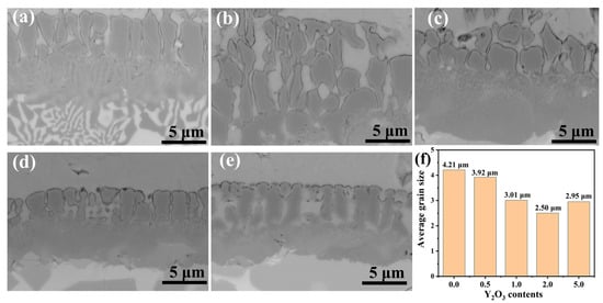BSE image of grains in FeCrAl coatings: (a) 0.0 wt.%; (b) 0.5 wt.%; (c) 1.0 wt.%; (d) 2.0 wt.%; (e) 5.0 wt.%; (f) Average grain size of coatings.