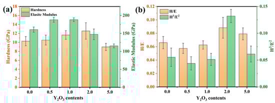 To investigate the effect of the rare-earth element Y on the mechanical properties of the coating, the hardness (H) and elastic modulus (E) of the FeCrAl coating were measured. As illustrated in Figure 6a, the nanoindentation hardness of the coating demonstrates a monotonic increase with Y2O3 concentration, achieving peak values (~12.5 GPa) at 2.0 wt.% Y2O3 doping. The addition of Y refines the grains by inhibiting grain growth. Consistent with the classical Hall–Petch relationship [23], the dispersion of secondary phase particles pinning the grain boundaries and dislocations impedes dislocation motion, thus enhancing the dispersion strengthening effect. Figure 6b presents the H/E and H3/E2 ratios of the coating. The H/E ratio is closely related to the coating’s resistance to damage and elastic strain capacity [24], while the H3/E2 ratio is indicative of the coating’s ability to resist crack initiation and propagation [25,26]. It can be observed that the H3/E2 ratio of the 2.0 wt.% coating is relatively high, indirectly confirming the refinement of the grains.