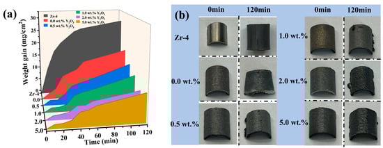 (a) Weight gain of Zr-4 and coatings in 1200 °C steam environment for different times; (b) Photographs of Zr-4 and coatings before and after 120 min oxidation.
