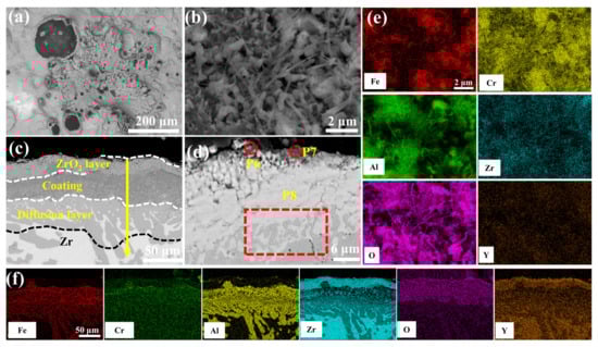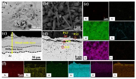 Figure 9 delineates the microstructural evolution of the undoped coating after 60 min of oxidation in a 1200 °C steam environment. Table 4 shows the elemental compositions of regions in Figure 9d, Figure 10d, Figure 11d, Figure 12d and Figure 13d. Irregular cracks are observed in the ZrO2 layer at protruding regions (Figure 9a). This observation aligns with Yang et al.’s report [28] demonstrating accelerated oxidation rate at convex surface features. The cracked ZrO2 layer exhibits large fissures (Figure 9b), exposing the underlying FeCrAl coating and accelerating further oxidation. Combined with the XRD results from Figure 8 and the EDS results from Figure 9e, it is evident that the main oxide phase in the coating is Cr2O3. The cross-sectional morphology of the coating (Figure 9c) shows that the cracks in the ZrO2 layer provide rapid diffusion pathways for oxygen, leading to the accelerated oxidation of Fe, Cr, and Al elements within the coating and the formation of large amounts of black, strip-like Al2O3. Furthermore, elemental diffusion results in the development of voids at the ZrO2 layer-coating interface.