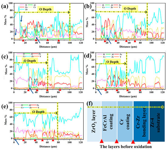 Figure 14 depicts the depth-dependent elemental mass fraction distributions in Y2O3-doped coatings following 60-min oxidation. The red triangular markers in the figures correspond to the interfaces of the first five layers of the structure before oxidation, from the surface to the substrate: the ZrO2 layer, the FeCrAl coating, the Cr transition layer, the Cr-Zr bonding layer, and the Zr-4 substrate. As shown in Figure 14a,b, the oxygen penetration depths for the undoped Y2O3 coating and the 0.5 wt.% doped coating reach approximately 100 μm and 90 μm, respectively, indicating that rapid oxidation promotes the infiltration of oxygen into the Zr-4 substrate. As the Y2O3 doping level increases, the oxygen penetration depth gradually decreases, reaching a minimum value (~56 μm) when the doping amount is 2.0 wt.%. Further analysis reveals a significant element interdiffusion phenomenon in the undoped Y2O3 coating. Chromium and oxygen accumulate at the ZrO2 surface and interface (Figure 14a), which results from its upward diffusion and subsequent oxidation reaction. Simultaneously, the oxygen penetration induces intense oxidation of aluminum in the coating, as evidenced by the black-striped aluminum oxide in Figure 9c. As the Y2O3 doping level increases, the aluminum element shows a tendency to migrate towards the surface (indicated by arrows in Figure 14b–e). Notably, under low doping concentrations (0.0–0.5 wt.%), Fe and Cr elements migrate towards the surface and diffuse into the ZrO2 layer, whereas coatings with higher doping concentrations (1.0–5.0 wt.%) maintain interface stability. In particular, the 2.0 wt.% doped coating forms a continuous Al2O3 oxide film on the surface, with a higher mass fraction of Fe and Cr and lower oxygen content (average 9.6 wt.%) in the coating, suggesting that the diffusion in this coating is minimal and oxidation is slight, thus exhibiting optimal stability. When the doping level is increased to 5.0 wt.%, although the interface remains stable, the increased oxygen content leads to significant weight gain due to oxidation.