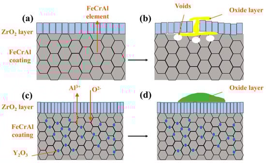 The enhanced oxidation resistance of the 2.0 wt.% Y2O3-doped coating originates from Y-mediated regulation of oxide growth mechanisms: Y segregation at grain boundaries suppresses Cr3+ outward diffusion while promoting O2- inward migration, thereby transforming the oxide growth mode from Cr3+-dominated epitaxial expansion to O2--involved cooperative reactions. Concurrently, Y facilitates short-circuit diffusion of Al3+ along high-density grain boundary networks, accelerating the dynamic formation of a surface Al2O3 scale. This oxide scale, enriched with Y at grain boundaries, minimizes structural defects and forms a dense barrier against oxygen penetration (Figure 12b,e). Furthermore, the pinning effect of Y2O3 particles at ZrO2 grain boundaries effectively inhibited grain growth and promoted grain refinement. This microstructural evolution resulted in the formation of a continuous and homogeneous dense ZrO2 structure in both 2.0 and 5.0 wt.% Y2O3-doped samples (enlarged view of ZrO2 in Figure 4f,h). The structural characteristics were corroborated by X-ray diffraction analysis, as the diffraction peak intensity exhibits a direct correlation with atomic ordering within the crystal lattice. Generally, higher crystallinity corresponds to sharper characteristic diffraction peaks due to enhanced long-range atomic ordering [37]. Notably, the 5.0 wt.% Y2O3-doped coating demonstrated relatively lower ZrO2 diffraction peak intensities (Figure 8a), indicative of substantially refined crystallites. This refined structure enhances oxygen-blocking efficiency and thermal stress resistance by mitigating interfacial defects and optimizing thermal expansion matching. The grain boundary pinning effect of Y not only refines ZrO2 grains but also establishes dynamic equilibrium between suppressed cation diffusion (Cr3+) and regulated anion transport (O2−), synergistically optimizing elemental migration resistance, scale densification, and interfacial stability. Under these mechanisms, the 2.0 wt.% Y2O3 coating achieves a 52% reduction in oxidation-induced mass gain (8.749 mg/cm2) compared to undoped systems, demonstrating optimal high-temperature protective performance. Figure 15 depicts the oxidation mechanisms of FeCrAl coatings.