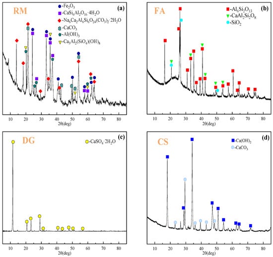 Specifically, RM was sourced from the An aluminum plant in Shanxi. Its chemical composition primarily consisted of Fe2O3, Al2O3, SiO2, Na2O, and TiO2, which collectively accounted for 97.83% of the total mass fraction. FA was obtained from a large power plant in Shanxi Province. The main chemical components included Fe2O3, Al2O3, SiO2, CaO, and SO3, with a combined mass fraction of 95.72%. DG was provided by a large power plant in Shanxi Province. Its chemical composition was dominated by CaO and SO3, which together constituted 99.83% of the total, with trace components accounting for less than 0.2%. CS was collected from a chemical plant in Shanxi Province. The primary component was CaO, making up 88.75% of the total, along with minor amounts of SiO2, Al2O3, Fe2O3, and SO3. SS was sourced from a metallurgical plant in Shanxi Province. The main chemical components were Fe2O3, SiO2, and CaO, with additional amounts of Al2O3, SO3, K2O, and Na2O. PC was commercially available PI 42.5 ordinary Portland cement, primarily composed of CaO and SiO2. Additionally, ordinary tap water was used throughout the experiments to ensure smooth procedures and reliable results. The detailed chemical compositions of all materials are comprehensively listed in Table 1.