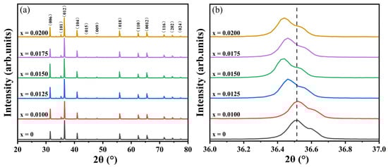 3+. At higher concentrations (x = 0.0175 and 0.0200), however, a non-monotonic shift pattern emerges: initial displacement to higher angles followed by a return to lower angles. This anomaly implies an optimal doping threshold at x = 0.0150, beyond which lattice distortion becomes dominant. Such behavior likely originates from point defect formation (cation vacancies or oxygen vacancies) that disrupts long-range crystallographic ordering.