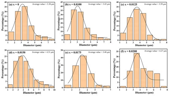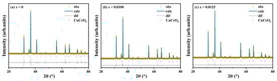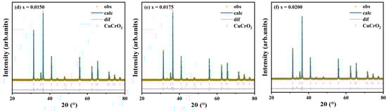 A series of CuCr1−xYxO2 (x = 0–0.02) ceramic samples was fabricated via the high-temperature solid-state reaction method using high-purity CuO (99.5%), Cr2O3 (99.9%), and Y2O3 (99.9%) nanopowders. The three powders were stoichiometrically weighed, and raw material powders with different doping concentrations were obtained by adjusting the ratio of Cr2O3 and Y2O3 powders. The three raw material powders were mixed and poured into an appropriate amount of alcohol so that the powder could be completely dispersed into the alcohol, then stirred with an electric stirrer for 24 h to mix the powder evenly. The mixed powder was placed in a drying oven at 85 °C for 24 h. After the alcohol was completely evaporated, the powder was ground for 30 min to make the powder fine enough. The powder was then calcined in a tube furnace in an argon atmosphere (20 mL/min) at a temperature of 900 °C for 12 h. After cooling, the powder was ground again to make the powder fine enough, and it was pressed under a pressure of 12 MPa to make a disc with a diameter of 15 mm. The final ceramic sample was obtained by calcining it in a tubular furnace in an argon atmosphere (20 mL/min) and at a temperature of 1300 °C for 12 h. The synthesized CuCr1−xYxO2 (x = 0–0.02) ceramics were systematically characterized for their microstructure and magnetic properties.