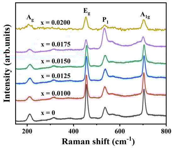 1 mode exhibits enhanced intensity until x = 0.0200, where its relative intensity normalizes, albeit with a significantly broadened full width at half-maximum. These observations indicate that Y