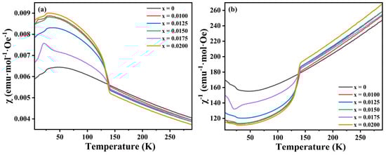 2 (x = 0–0.02) ceramic samples across 4–290 K. For the undoped specimen, χ demonstrates a linear enhancement with decreasing temperature above 50 K, reaching a maximum value that signifies paramagnetic behavior. Upon further cooling, a progressive reduction in χ emerges, accompanied by a transition from paramagnetic to antiferromagnetic characteristics. The Néel temperature T