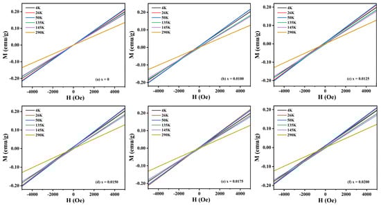 Figure 8 presents magnetic hysteresis loops measured under a ±5000 Oe applied field at different temperatures (4 K, 26 K, 50 K, 135 K, 145 K, and 290 K). All specimens exhibit linear M-H relationships without magnetic saturation, differing solely in their slope magnitudes. Compared with that for the undoped sample, the change in the hysteresis loop slope increases obviously when the doped sample decreases from 145 K to 50 K. The curve slopes of 26 K and 50 K are the largest in all samples, corresponding to T