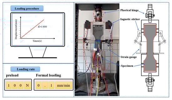 The uniaxial tensile test in this study was carried out in accordance with the GB/T 50081-2019 standard [48] and the CECS 13-2009 standard [49]. The loading test was performed using an electronic universal testing machine (UTM, Model Instron5567, Instron Corporation, Boston, MA, USA) with a range of 30 kN. The test system employs a bidirectional spherical hinge linkage mechanism to achieve neutral load transfer, with specimens secured by bidirectional dedicated fixtures. During installation, transverse adjustment bolt sets are symmetrically tightened to ensure precise alignment between the loading axis and the specimen’s geometric centerline. In the preloading phase, a closed-loop controlled preload force of 100 N is applied at a deformation rate of 0.05 mm/min, while bilateral extensometer data are synchronously analyzed to verify alignment neutrality. The system automatically halts and triggers a reset calibration procedure when strain deviation exceeds 2%, effectively eliminating system clearance and compensating for elastic deformation. The formal loading phase maintains a constant rate of 0.1 mm/min, with experimental device configurations and loading procedures illustrated in Figure 3. As shown in Figure 3, two longitudinal and two transverse strain gauges were arranged in the middle effective zone of the specimen, and two clamped extensometers were placed at the left and right ends to measure the tensile deformation of the specimens. The strain and deformation of the specimens were collected by the dynamic digital acquisition instrument (DSA, Model DH3820N, Donghua Testing Technology, Taizhou, China). The acquisition frequency of the universal testing machine and the data acquisition instrument were set to 10 Hz to ensure the synchronization of strain, deformation, and load change data.