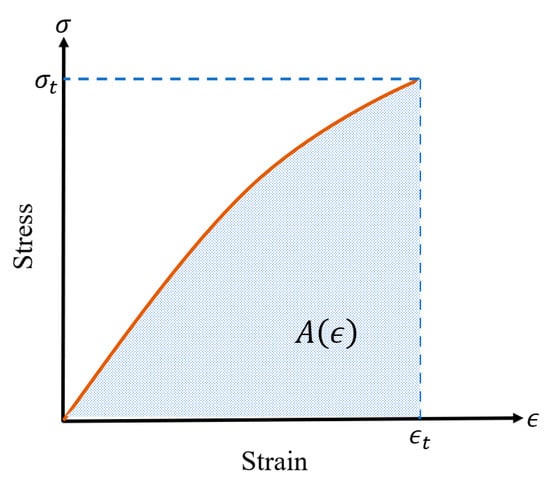 where is the strain energy, calculated by the area under the stress–strain curve in the direct tensile test, according to Figure 4. denotes the ultimate strain of the specimen. is strain corresponding to a moment in the axial tensile test, and is the corresponding stress.
