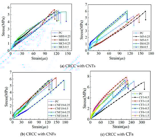 Figure 7c presents the stress–strain curves of CRCC specimens reinforced with different types of CFs under uniaxial tensile loading. The study reveals that the incorporation of CFs significantly enhances the ultimate strain of CRCCs (increased by 66.8%~140.8%), with the nonlinear characteristics of the curves becoming more pronounced as the fiber content increases. Notably, the tangent slope of the curves gradually decreases in the peak region, indicating that CFs effectively improve the toughness of CRCCs by delaying crack propagation. This phenomenon aligns with the conclusions from Zahra S [58] and Chen [59] regarding the toughness enhancement mechanisms in carbon fiber-reinforced concrete. However, the chopped carbon fiber-reinforced composites in this test exhibited limited post-peak load ductility, which may be attributed to the synergistic effects of fiber type, orientation, and interfacial bonding properties on the mechanical response of the composite material.