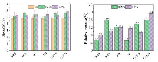 The effect of nano-scale fibrous materials on the uniaxial tensile strength of CRCCs at 0.25 wt.% and 0.50 wt.% doping levels is shown in Figure 8. The dark blue horizontal line in the graph represents the stress baseline of PC group. CNF24 demonstrates the most significant enhancement of uniaxial tensile strength at 0.25 wt.% doping. Further increasing the doping amount to 0.50 wt.%, the uniaxial tensile strength of CRCCs incorporating MHI, MCI, M5, IM, and CNF19 are improved by 8.1%, 10.2%, 12.1%, 11.5%, and 9.4%, respectively, compared with the blank group. Also, CNF24 again exhibits the best enhancement effect of uniaxial tensile strength with an increase of 19.4%/0.95 MPa. However, it is also found that CRCCs doped with MCI and CNF19 show a decrease in uniaxial tensile strength as the filler content increases. In addition, the uniaxial tensile strength of CRCCs remains essentially unchanged when the doping of M5 rises from 0.25 wt.% to 0.50 wt.%. These phenomena may be attributed to the strong van der Waals forces causing some of the nanofillers to entangle and adhere to the surface of the cement particles at high dosages, forming an inhomogeneous slurry [55]. In this case, the pores and voids inside the CRCCs increase, and the matrix compactness decreases, thus weakening the reinforcing effect of the nanofillers [25]. Moreover, the differences in the optimal dispersion method, optimal sonication time, and optimal water-reducing agent dosage between the different nanofiller types may also lead to CRCCs exhibiting different uniaxial tensile strength development patterns.