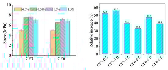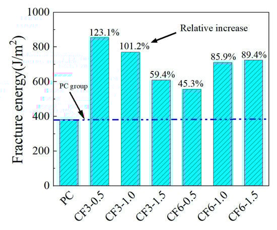 The fracture strain energies of different CRCCs doped with CFs under uniaxial tensile loading are presented in Figure 11. It is evident from Figure 11 that the fracture strain energy of CRCCs shows a general trend of gradual decrease with the increase in CF3 doping. The fracture strain energies of CRCCs doped with CF3 at 0.50 vol.%, 1.0 vol.%, and 1.5 vol.% dosage are separately 123.1%, 101.2%, and 59.4% higher than that of blank composites. Meanwhile, the improvements of the fracture strain energy of CRCCs doped with CF6 are 45.3%, 85.9%, and 89.4%, respectively, generally showing a trend of gradual increasing. Comprehensively, both CF3 and CF6 show significant improvements in fracture strain energy at 1.0 vol.% doping, which is consistent with the impact of CFs on the uniaxial tensile strength of CRCCs.