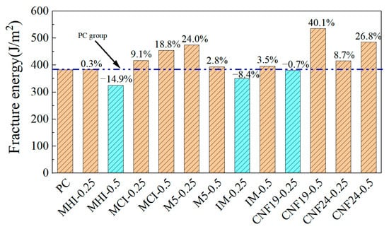 The fracture strain energies of CRCCs with different carbon nanofillers under a uniaxial tensile load were obtained by the corresponding data processing and calculation of the uniaxial tensile stress–strain curves, as followed in Figure 10. Under uniaxial tensile loading, except for the addition of 0.50 wt.% MHI, 0.25 wt.% IM, and 0.25 wt.% CNF19, the incorporation of other types and dosages of nanofillers can improve the fracture strain energy of the composites. The contribution of the four nanofillers to the fracture strain energy of CRCCs at high doping are greater than those at low doping, except for M5 and MHI. The significant deviation in the fracture strain energy of composites under the same test conditions is mainly due to differences in the appearance and development of microcracks within the CRCCs during the loading process, as well as apparent differences in the bridging effect and microcrack inhibition capabilities of the different types and dosages of nanofillers added [18]. It can also be found that the 0.50 wt.% dosage of CNF19 and CNF24 exhibits the most pronounced enhancement in the fracture strain energy of CRCCs.