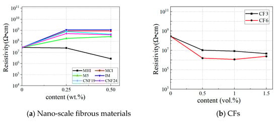 Figure 12 shows the variation in the test volume resistivity of CRCCs with different carbon fillers. It can be observed from Figure 12 that the blank composite without carbon fibers exhibits a high resistivity of 3.56 × 108 Ω·cm, indicating that the base composite itself has a high resistivity. In addition, the incorporation of nano-scale fibrous materials, except for MHI, fails to improve the electrical conductivity of CRCCs. On the contrary, incorporating these fillers further increases CRCC’s resistivity by an order of magnitude higher than the blank group. This may be due to the non-uniform distribution of these nanofillers in the CRCC matrix or their poor bonding with the matrix, resulting in the isolation of the conductive pathways. Nonetheless, it is gratifying to note that the incorporation of MHI demonstrates potential for improving the electrical conductivity of CRCCs. As the MHI doping increases from 0.25 wt.% to 0.50 wt.%, the resistivity of CRCCs decreases significantly, thus confirming that MHI effectively enhances the conductivity of composites. In other words, MHI is more prone to exhibiting conductivity and forming an effective conductive network than other nano-scale fibrous materials, thereby enhancing the electrical conductivity of CRCCs. Furthermore, as the doping amount of MHI increases the resistivity of CRCCs decreases, indicating that the conductive network has gone through the process of absence, emergence, and abundance.