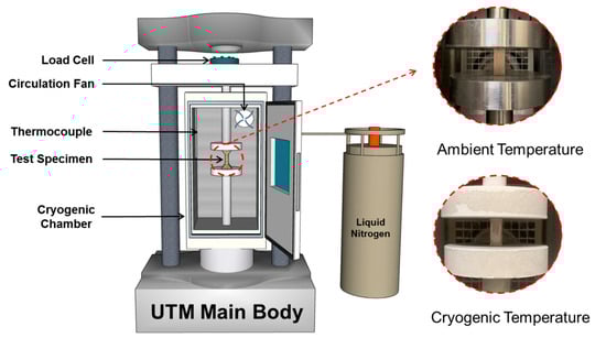 Compression tests were performed using a universal testing machine (UTM, Kyoungsung Testing Machine Co., Ltd., Anyang-si, Korea) designed for composite materials, with a maximum load capacity of 50 kN. The maximum load and crosshead speed were set to 0.001 and 400 mm/min, respectively. A cryogenic chamber was employed to maintain either room temperature or cryogenic conditions during testing. To reach cryogenic temperatures, liquid nitrogen (LN2) was continuously injected into the chamber until the target temperature was achieved. A solenoid valve regulated the injection process, automatically stopping when the internal thermocouple detected the target temperature and resuming when the temperature rose above the set point [24].