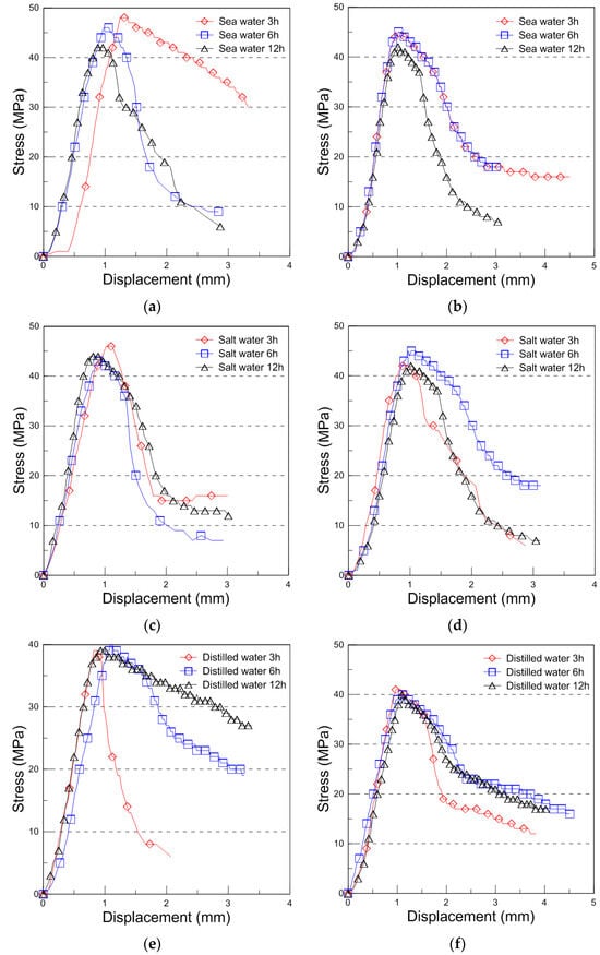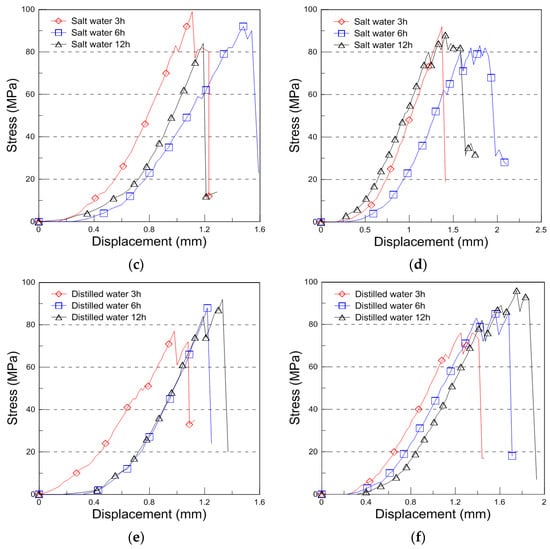 Compressive stress with displacement curve for the seawater, saltwater, and distilled water immersion ((a): 9 mm, (b): 18 mm thickness for the seawater immersion, (c): 9 mm, (d): 18 mm thickness for the saltwater immersion, (e): 9 mm, and (f): 18 mm thickness for the distilled water immersion).