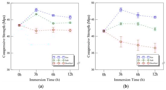 - Saltwater immersion produced a moderate strength increase of approximately 10% after 3 h, whereas distilled water immersion led to an 8–10% decrease in strength over the same period.