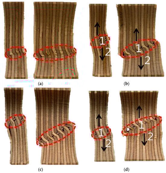 The microscopic image of the fractured specimens for the seawater immersion plywood of 9 and 18 mm thickness for (a) 3 h and (b) 12 h and the saltwater immersion plywood of 9 and 18 mm thickness for (c) 3 h and (d) 12 h. 1. Innermost veneers break; 2. Fractures propagate along the grain.