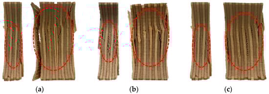 Figure 9 presents microscopic images of the fractured 9 mm and 18 mm plywood specimens after immersion in seawater, saltwater, and distilled water. As shown, the specimens exhibited distinct deformation characteristics under cryogenic conditions depending on the immersion type. The red-highlighted areas in Figure 9 indicate the fracture surfaces of the tested plywood specimens. The veneers primarily exhibited interlaminar shear failure, particularly within the weaker middle layers, accompanied by delamination at the interfaces and localized compressive failure. These failure modes differed significantly from those observed at room temperature, where buckling was the dominant failure mechanism. These findings further confirm that plywood demonstrates enhanced compressive strength under cryogenic conditions compared to room temperature. Table 5 shows the detailed compressive strength obtained from the test results.