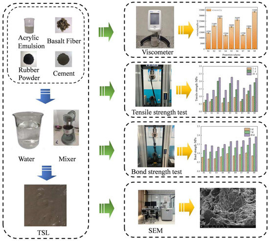 In summary, the use of acrylic emulsion, basalt fiber, and rubber powder as modifiers can solve the problems of low tensile strength and poor toughness of traditional cement-based TSL, thus improving their mechanical properties. This provides a feasible way for high flexibility and toughening modification of cement-based TSL. However, in order to further improve the mechanical properties of TSL, it is necessary to further explore other additives to further optimize the mechanical properties of TSL.