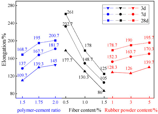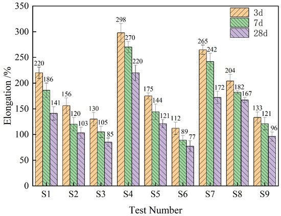 It can be seen from Figure 4 that the elongation of composite TSL at different ages is roughly positively correlated with the polymer–cement ratio and rubber powder content, and is roughly negatively correlated with the basalt fiber content. It can be seen from Table 6 that the influence of various factors on the composite TSL is basalt fiber > polymer–cement ratio > rubber powder content. Acrylic emulsion and rubber powder increased the elongation, and basalt fiber reduced the elongation. The optimal ratio of elongation is A3B1C3, that is, the polymer cement ratio is 2.0, the basalt fiber content is 0.5%, and the rubber powder content is 5%.