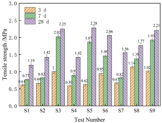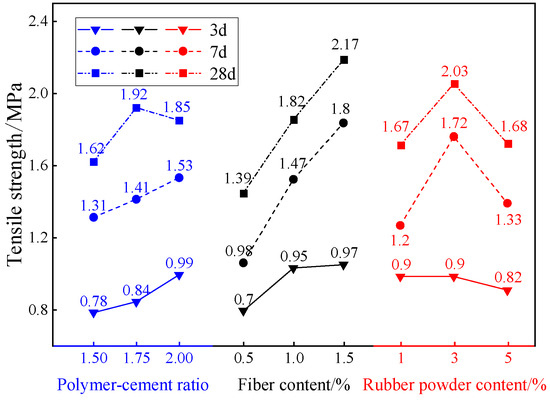 Figure 6 shows the tensile strength test results of different proportions of composite TSL at different ages. According to the data in the figure, the mean and range of the tensile strength of each factor at different levels and different ages are calculated respectively. The results are shown in Figure 7 and Table 7. It can be seen from Figure 7 that the tensile strength of composite TSL at different ages is positively correlated with the polymer–cement ratio and basalt fiber content. When the rubber powder content is less than 3%, there is a positive correlation, and when it is greater than 3%, there is a negative correlation. It can be seen from Table 7 that the basalt fiber has the greatest influence on the tensile strength of the composite TSL, which improves the tensile strength of the TSL. The polymer–cement ratio has a great influence on the 3 d age TSL, and the rubber powder content has a great influence on the 7 d and 28 d TSL, which increases first and then decreases the tensile strength of the TSL. The optimal ratio of the tensile strength of the 28 d TSL is A2B3C2; that is, the polymer–cement ratio is 1.75, the basalt fiber content is 1.5%, and the rubber powder content is 3%.