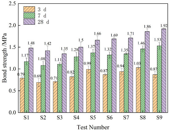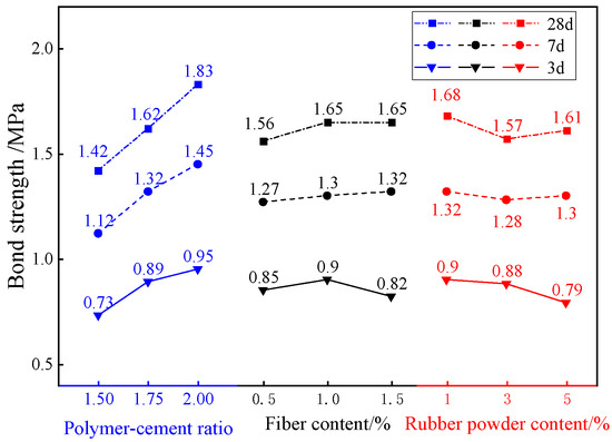 Figure 8 is the uniaxial tensile bond strength test results of composite TSL with different ratios at different ages. According to the data in the figure, the mean and range of the uniaxial tensile bond strength calculation of each factor at different levels and different ages are calculated respectively. The results are shown in Figure 9 and Table 8. From Figure 9, it can be seen that the uniaxial tensile bond strength of the composite TSL at different ages is positively correlated with the polymer–cement ratio; it is negatively correlated with the amount of rubber powder; there is a positive correlation when the basalt fiber content is less than 3%, and a negative correlation when it is greater than 3%. It can be seen from Table 8 that the polymer–cement ratio has the greatest influence on the bond strength of the TSL, which increases the bond strength of the TSL. The optimal ratio of the bond strength of the 28 d TSL is A3B2C1; that is, the polymer–cement ratio is 2.0, the basalt fiber content is 1.0%, and the rubber powder content is 1%.