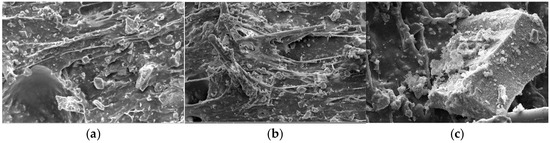 Microstructure of hydration 28 d of composite TSL. (a) SEM image of polymer-containing scanned electron microscope; (b) SEM image of fiber-containing fibers; (c) SEM image with rubber powder.