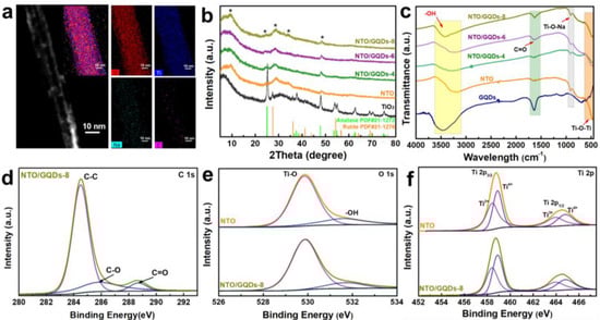 (a) STEM images of NTO/GQDs-8 with corresponding EDS element mapping. (b) XRD patterns (The asterisks (*) denote characteristic diffraction peaks of NTO), (c) FTIR spectra of TiO2, GQDs, NTO, and NTO/GQDs with varying GQD loadings. (d–f) XPS spectra of NTO and NTO/GQDs-8.
