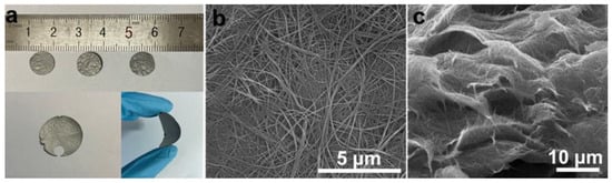 Porous self-supporting membranes were prepared through the vacuum filtration of ultralong NTO nanotubes/GQDs. These membranes exhibit excellent toughness, allowing for flexibility in bending and customization into various shapes and sizes, as shown in Figure 3a. This adaptability makes them highly suitable for diverse photocatalytic antibacterial applications. To examine the morphology and formation process of NTO/GQD self-supporting membranes, SEM analysis was performed on both the surface and longitudinal cross-section of the membranes. During the vacuum filtration process, the ultralong NTO nanotubes/GQDs are arranged in a staggered pattern along the horizontal direction (Figure 3b). The horizontally interwoven layers stack under the combined effects of gravity and vacuum filtration, resulting in the formation of porous self-supporting membranes (Figure 3c). The excellent toughness of the self-supporting membrane is primarily derived from the three-dimensional network formed by NTO/GQD ultralong nanotubes and the mechanical advantages of the materials themselves.