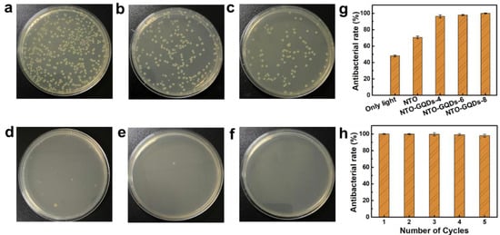 Digital images of E. coli after the treatment: (a) without catalysts and light irradiation, (b) without catalysts but with light irradiation, and (c–f) with NTO, NTO/GQDs-4, NTO/GQDs-6, and NTO/GQDs-8 as catalysts and light irradiation, respectively. (g) Antibacterial rates of different samples. (h) Antibacterial performance of NTO/GQDs-8 over five cycles.