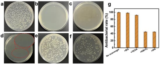 Digital images of E. coli treated with NTO/GQDs-8 and different trapping agents: (a) control, (b) no trapping agents, (c) BQ, (d) TEOA, (e) KBrO3, (f) IPA. (g) Antibacterial rates of NTO/GQDs-8 with different trapping agents.
