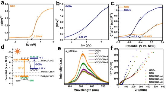 Tauc plots of (a) NTO and (b) GQDs. (c) Mott–Schottky plots and (d) schematic illustration of the S-scheme charges transfer mechanism in the NTO/GQDs heterojunction system. (e) PL spectra and (f) EIS plots of NTO, GQD, and NTO/GQD samples.