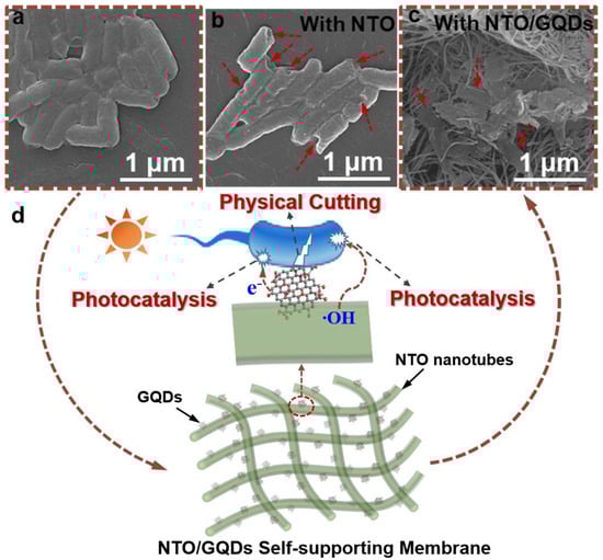 To further investigate the photocatalytic antibacterial mechanism of NTO/GQDs, the morphology and structure of E. coli cells after the treatment with NTO and NTO/GQDs-8 was observed using SEM. The morphology of untreated E. coli cells is smooth and plump, with intact cell walls and membranes, indicating that the bacteria are in a healthy state (Figure 7a). After the photocatalytic reaction with NTO, the morphology of E. coli cells underwent significant changes, as shown in Figure 7b. Almost every cell exhibits damage to its cell wall; however, these damages are localized, and the overall structure of the bacterial cells is still largely preserved. When NTO/GQDs-8 is used as the catalyst, the E. coli cells after photocatalytic treatment are completely fragmented, with no intact cell structures remaining. This indicates that NTO/GQDs-8 exhibits a more thorough antibacterial effect as a catalyst. Generally, at a short time of photocatalytic treatment, E. coli cells only deform, characterized by surface protrusions and pits (Figure 7b). With extended treatment, the cells become severely distorted and eventually fractured [55]. Therefore, the bacterial morphology in Figure 7c is not solely the result of NTO/GQDs-8 photocatalytic antibacterial action. GQDs not only enhance the photocatalytic activity of NTO, but the GQD nanoplates embedded in the NTO matrix also function as “nanoknives” that cut bacterial cells [19,20,21,22,56]. In synergy with photogenerated active oxygen species, they accelerate the destruction of bacterial cells and more effectively degrade the cell remnants, thereby reducing the toxicity of the bacterial debris (Figure 7d). As shown in Table S1, an NTO/GQD membrane displays superior antibacterial kinetics which under comparable light intensity (~40 mW/cm2) achieves 99.99% E. coli inactivation within 60 min, outperforming TiO2 nanotubes (>99% in 60 min) and Ag/TiO2 coatings (>98% in 30 min). Despite lower power density (39 vs. 100 mW/cm2), NTO/GQDs match the performance of Ag/TiO2 nanofiber membranes (99.9% in 30 min). GQDs provide dual functionality, including physical disruption via GQDs, and photogenerated ·OH and e−. The NTO/GQD membrane shows promise for water disinfection, air purification, protective textiles and self-sterilizing medical masks.