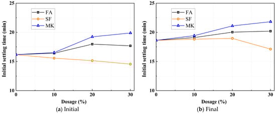 As shown in Figure 4, different mineral admixtures exert distinct effects on the initial setting time. The initial setting time increases with higher dosages of FA and MK, while it decreases with higher SF content. For example, at a 30% FA and MK dosage, the initial setting time increases from 16.17 min to 17.18 min and 19.88 min, respectively. Conversely, when the SF dosage reaches 30%, the initial setting time decreases from 16.17 min to 14.55 min. This is attributed to the relatively low pozzolanic activity of FA, which results in slower early-stage reactions, while its particle-induced “ball-bearing effect” enhances the fluidity of the slurry, thereby delaying the setting process. MK, exhibiting lower pozzolanic activity than slag, also retards the setting process. SF, characterized by its high specific surface area and pronounced pozzolanic reactivity, rapidly reacts with alkaline activators to form C-S-H, thereby accelerating early hydration reactions and expediting the setting process.