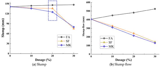 Figure 5b illustrates the influence of different mineral admixture replacement ratios on the slump flow of the mixture. Similar to the influence pattern observed in a slump, the slump flow of the mixture increases with higher dosages of FA. When the FA dosage reaches 30%, the slump flow increases from 405 mm to 524.5 mm. As also indicated by the figure, contrary to the trend observed with FA, the slump flow of the mixture significantly decreases with the increase in SF and MK dosage. When the dosage is increased to 30%, the slump flow of the mixture decreases from 405 mm to 142.5 mm and 129.5 mm, respectively.