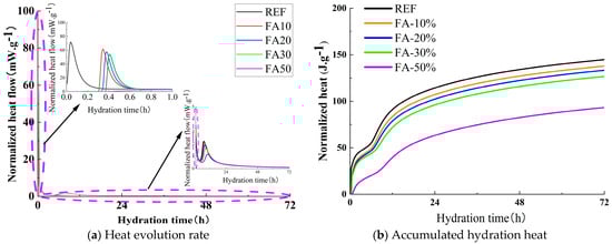 Figure 6a illustrates the influence of FA dosage on the hydration heat release rate. As shown in the figure, unlike the reference group, which initiated the reaction immediately, FA10, FA20, and FA30 began their initial reactions at 0.30 h, 0.34 h, and 0.37 h, respectively. The normalized heat flow directly reflects the reaction intensity. The normalized heat flow values for the initial reaction peaks of the reference group, FA10, FA20, FA30, and FA50 were 71.54 mW/g, 61.60 mW/g, 57.34 mW/g, 53.95 mW/g, and 2.69 mW/g, respectively. Compared with the reference group, the peak intensities of FA10, FA20, FA30, and FA50 decreased by 13.89%, 19.85%, 24.59%, and 96.24%, respectively. During the acceleration period, the normalized heat flow values for the acceleration peaks of the reference group, FA10, FA20, FA30, and FA50 were 2.21 mW/g, 2.11 mW/g, 1.91 mW/g, 1.65 mW/g, and 1.16 mW/g, respectively. The peak intensities of FA10, FA20, FA30, and FA50 decreased by 4.52%, 13.57%, 25.34%, and 47.51%, respectively, compared with the reference group. In summary, the incorporation of FA delayed the onset of the initial reaction period, extended the duration of the induction period, and reduced the reaction rates during both the initial reaction and acceleration periods. Additionally, the reaction rate decreased as the FA dosage increased.