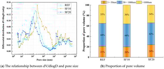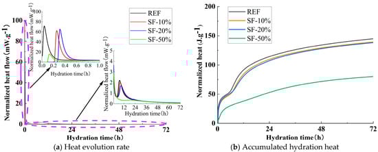 Figure 7b illustrates the influence of SF dosage on the cumulative hydration heat. As shown in the figure, after 24 h of cumulative heat release, the reference group exhibited a hydration heat of 114.4 J/g, while SF10, SF20, and SF50 showed hydration heats of 109.5 J/g, 107.3 J/g, and 52.9 J/g, respectively. These values represent reductions of 4.25%, 6.23%, and 53.71% compared with the reference group. After 72 h of cumulative heat release, the reference group exhibited a hydration heat of 144.8 J/g, while SF10, SF20, and SF50 showed hydration heats of 139.3 J/g, 138.1 J/g, and 80.1 J/g, respectively. These values represent reductions of 3.77%, 4.58%, and 52.9% compared with the reference group.