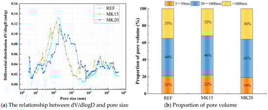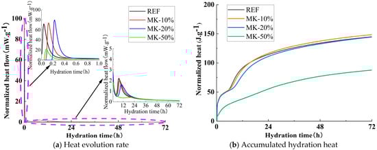 Figure 8b illustrates the influence of MK dosage on the cumulative hydration heat. As shown in the figure, after 24 h of cumulative heat release, the reference group exhibited a hydration heat of 114.4 J/g, while MK10, MK20, and MK50 showed hydration heats of 116.4 J/g, 111.0 J/g, and 55.2 J/g, respectively. MK10’s hydration heat increased by 1.75% compared with the reference group, whereas the MK20 and MK50 hydration heats decreased by 2.97% and 51.75%, respectively. After 72 h of cumulative heat release, the reference group reached a hydration heat of 144.8 J/g, while MK10, MK20, and MK50 achieved hydration heats of 148.5 J/g, 144.4 J/g, and 87.6 J/g, respectively. MK10’s hydration heat increased by 2.56% compared with the reference group, whereas the MK20 and MK50 hydration heats decreased by 0.28% and 39.50%, respectively.