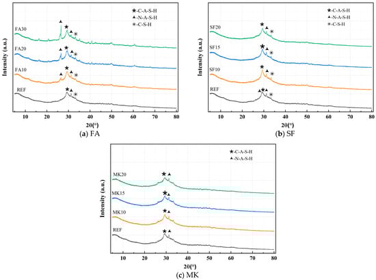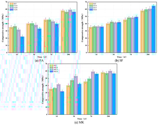 Figure 9a–c show the effect of FA, SF, and MK on the compressive strength of the paste. As shown in Figure 9a, the compressive strength generally increases with the FA dosage up to a certain point, after which it decreases, with the 10% dosage yielding the optimal performance. At a 10% FA dosage, the compressive strengths of the specimens at 1, 3, and 7 days increase by 3.42%, 0.85%, and 0.36%, respectively, compared with the reference group. However, increasing the FA dosage beyond 10% significantly impairs early-age compressive strength, with the negative impact becoming more pronounced at higher dosages. Specifically, FA20 and FA30 show 10.04% and 37.09% reductions in 1-day compressive strength, respectively, compared with the reference group. As the curing age progresses, the compressive strength growth rates of FA20 and FA30 specimens gradually accelerate. At 28 days, the compressive strength of FA30 is only 2.85% lower than that of the reference group (without FA), while FA20 achieves a 2.21% increase over the reference group. These results indicate that, at an appropriate FA dosage, the micro-aggregate effect and filling effect of FA improve the compactness of the paste, offsetting the adverse effects caused by its lower reactivity. With prolonged curing, the pozzolanic activity of FA is gradually activated under the continuous stimulation of alkali activators, enhancing the compressive strength growth rate. Consequently, the 28-day compressive strengths of specimens with different FA dosages become comparable to that of the reference group.
